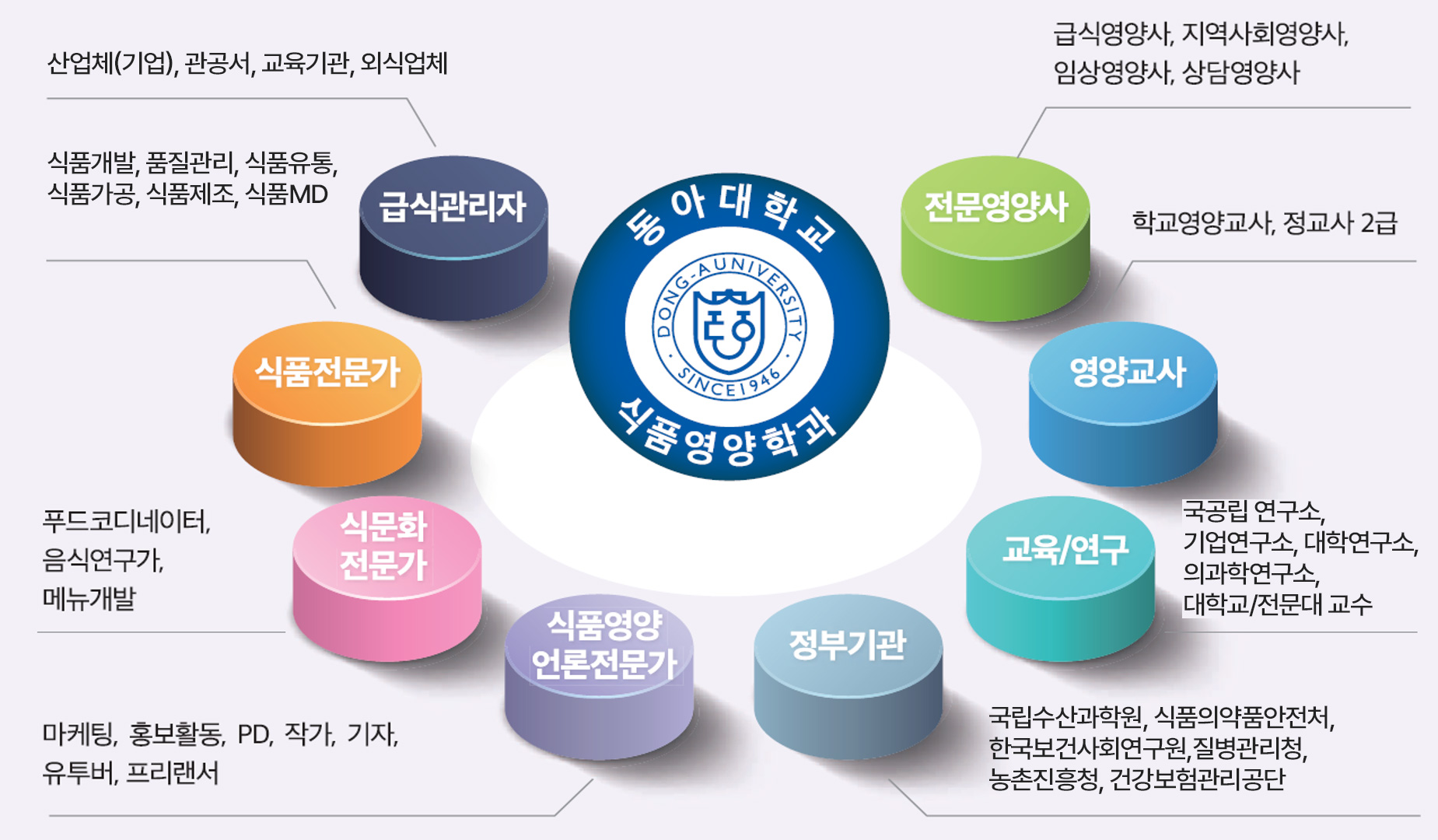 현대를 살아가는 우리는 과학기술과 의료기술의 발달로 평균수명 연장의 시대를 맞이하였다. 반면 급변하는 경제· 사회적 변화와 식생활 문화의 변화는 우리에게 만성퇴행설질환의 증가라는 또 다른 문제점도 안겨주고 있다. 수명연장에 앞서 더욱 중요한 것은 질병 없이 건강하게 오래 사는 것이다. 그렇기에 우리가 태어나면서부터 늘 접하게되는 식생활은 그 무엇보다도 건강 유지에 중요한 부분이라고 할 수 있다. 동아대학교 식품영양학과는 인간의 건강 증진과 질병 예방 및 치료를 위한 올바른 식생활, 영양의 균형, 영양소의 역할, 양질의 식품 및 식품소재, 식품안전성, 수준 높은 급식경영 교육을 실시하여 높은 삶의 질 지향을 위한 학문연구와 그의 실천 및 응용을 목표로 하고 있다. 이를 통해 다변화되어 가는 사회 요구에 부응 할 수 있는 식품영양학 분야의 전문인을 배출하고자 한다.